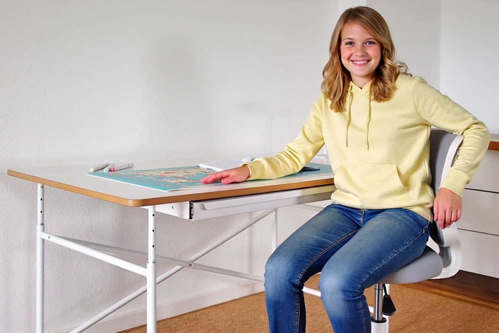 Wichtig sind eine stabile, pflegeleichte Arbeitsfläche, Schubladen für Stifte, Bastel- und Malzeug, eine ergonomische Höhenverstellung sowie eine gute Beleuchtung, am besten mit Tageslicht. Auch eine schrägstellbare Platte kann sinnvoll sein.